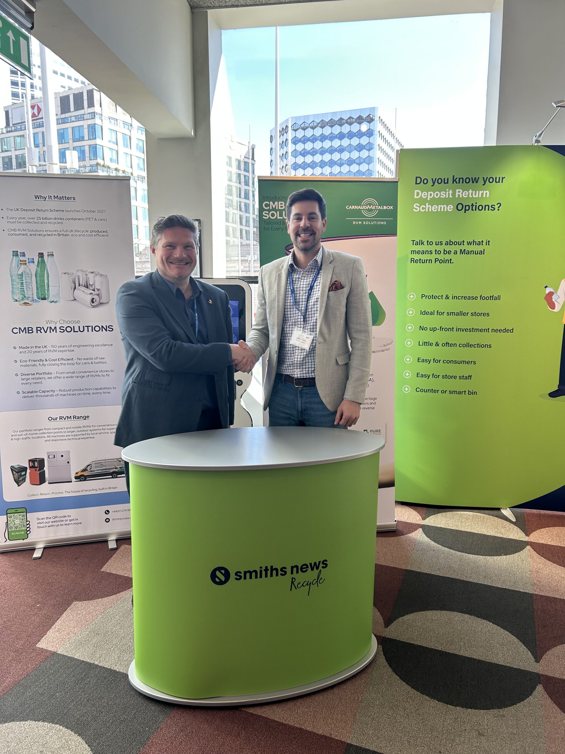 A partnership has been announced between Smiths News Recycle and CMB RVM Solutions to offer a smaller RVM option ahead of the UK’s DRS being introduced.
