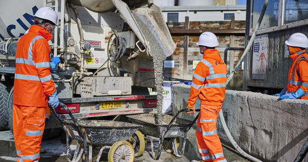 Real estate giant pours an innovative concrete mix developed by Holcim containing CO2-removing coppiced wood and spent coffee grounds that promise to cut embodied emissions