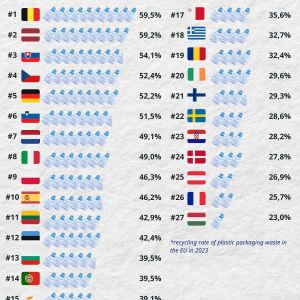 ♻️ An average of 35.3 kg of plastic packaging waste was generated in 2023 for each person living in the EU. Out of this, 14.8 kg were recycled.