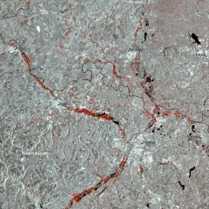 The flooded areas along the Polish-Czech border are visible in this image acquired by the Copernicus Sentinel-1A radar satellite on 15 September 2024.